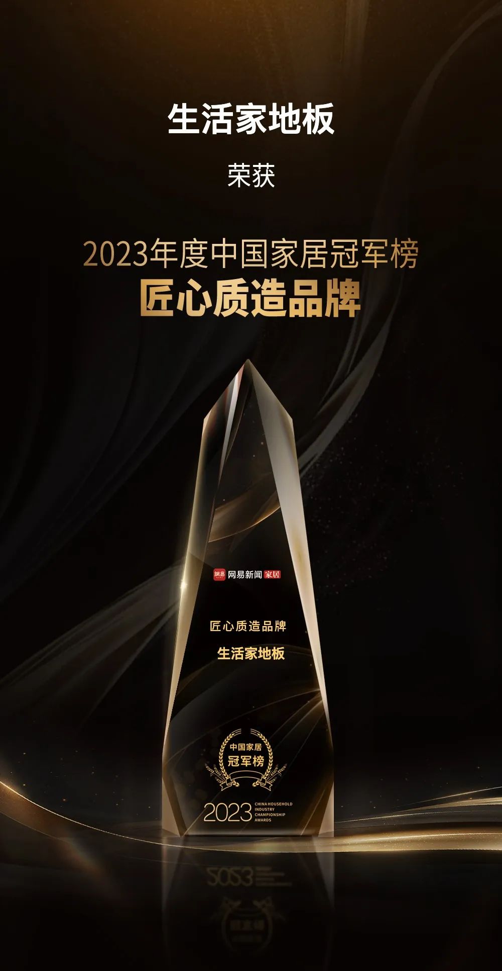2023年12月27日,“向好生活提案——2023網易中國家居冠軍榜頒獎盛典”隆重舉行,各大獎項重磅揭曉,生活家地板憑借出色的產品、強大的品牌影響力和良好的用戶口碑,一舉斬獲2023年度中國家居冠軍榜“匠心質造品牌”,總經理林德英榮獲2023年度中國家居冠軍榜“時代前行者”稱號!