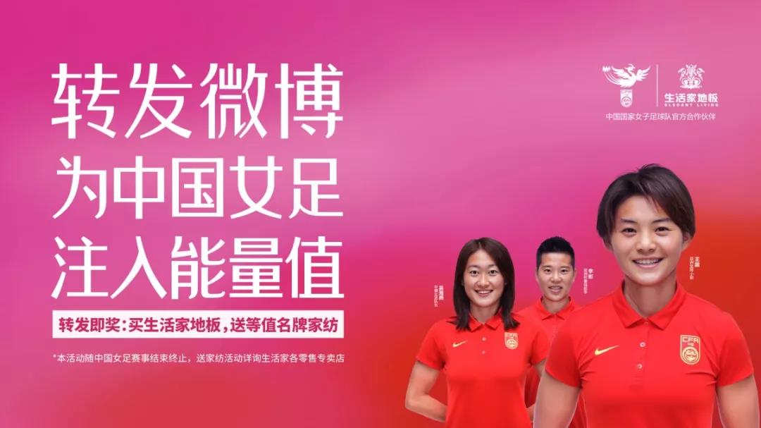 從巴洛克文化到戀家文化,生活家一直倡導高品味的生活方式和積極的生活態度,不僅是把高品質的產品帶給千家萬戶,還賦予了產品更多的文化內涵,為消費者帶來超越產品本身的價值體現。2019年1月,生活家地板成為中國女足官方合作伙伴??炭囝B強的拼搏精神、精誠一致的團隊精神、永不放棄的挑戰精神,是雙方精神上的契合,也是理念上的契合。5-6月,為呼吁全民關注女足,助力中國女足發展,法國女足世界杯期間,生活家地板在新浪微博發起了#轉發微博為中國女足注入能量值#的線上線下聲援行動,迎來了4.5億次曝光,數百萬網友參與討論,近50萬位網友自主轉發微博,為中國女足積極打call。